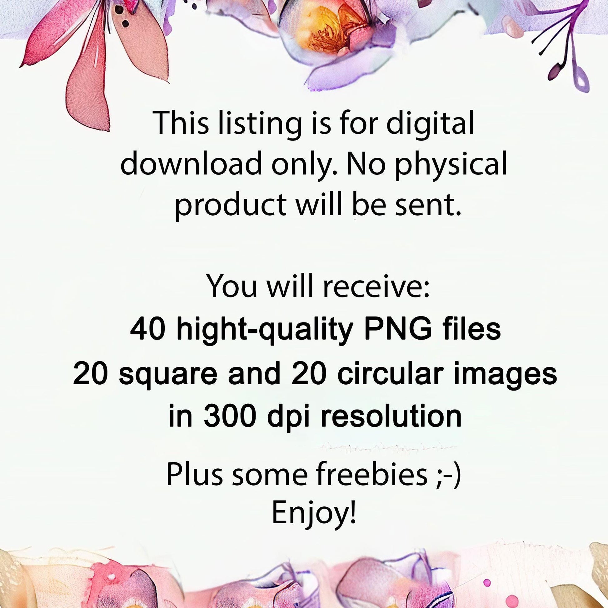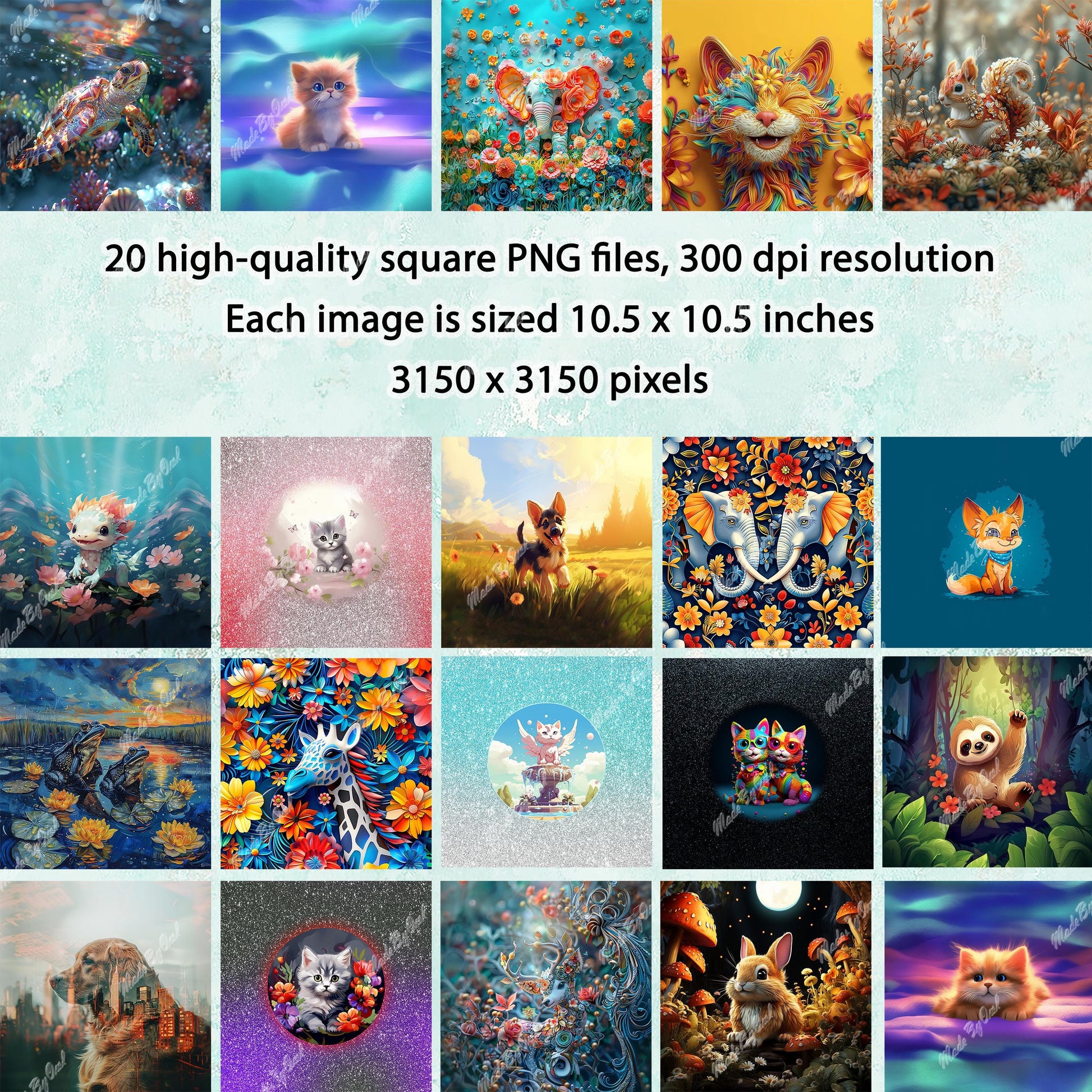 - 20 square PNG images — 10.5 x 10.5 inches (3150 x 3150 px).