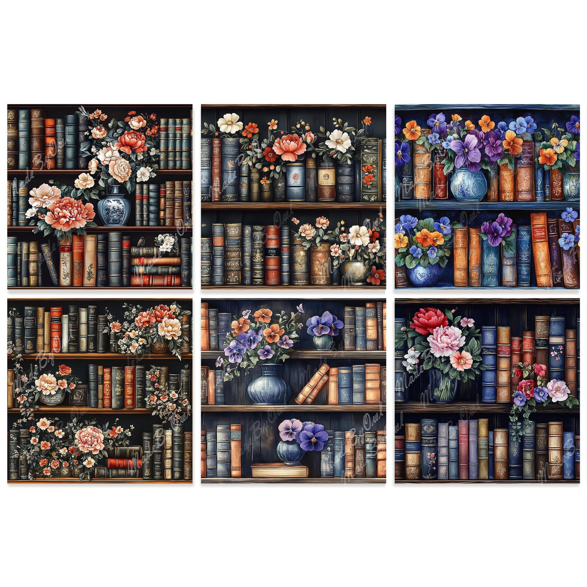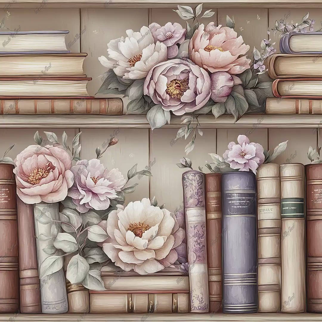 High-quality Books & Flowers Seamless Digital Paper Pack for versatile use. Ready for both creative and commercial projects. Each file can be used as a Floral Bookshelf background, digital scrapbook paper, and seamless pattern for fabric, packaging, and any other surface.